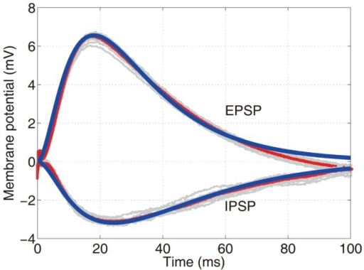 As an EPSP or IPSP propagates passively down a dendrite, it is altered by the physical properties of the neuronal membrane. This distorts the shape of an EPSP or an IPSP, so that if the electrical potential was recorded at a distance from the synapse where the potential was generated, it would look quite different that near the synapse. By use of cable theory, the change in the properties of an EPSP or IPSP as it moves down a membrane can be modeled mathematically. However, this is certainly beyond the scope of this course.