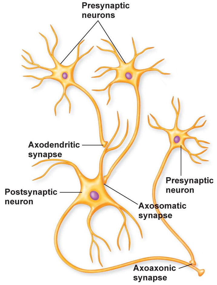Most synapses are axo-dendritic (i.e., the synapse is on a dendrite) or axo-somatic (i.e., the synapse is on the neuronal soma), as described above. However, other synaptic configurations also exist. One such configuration is the axo-axonic synapse, where an axon of one neuron synapses on the axon of another neuron.