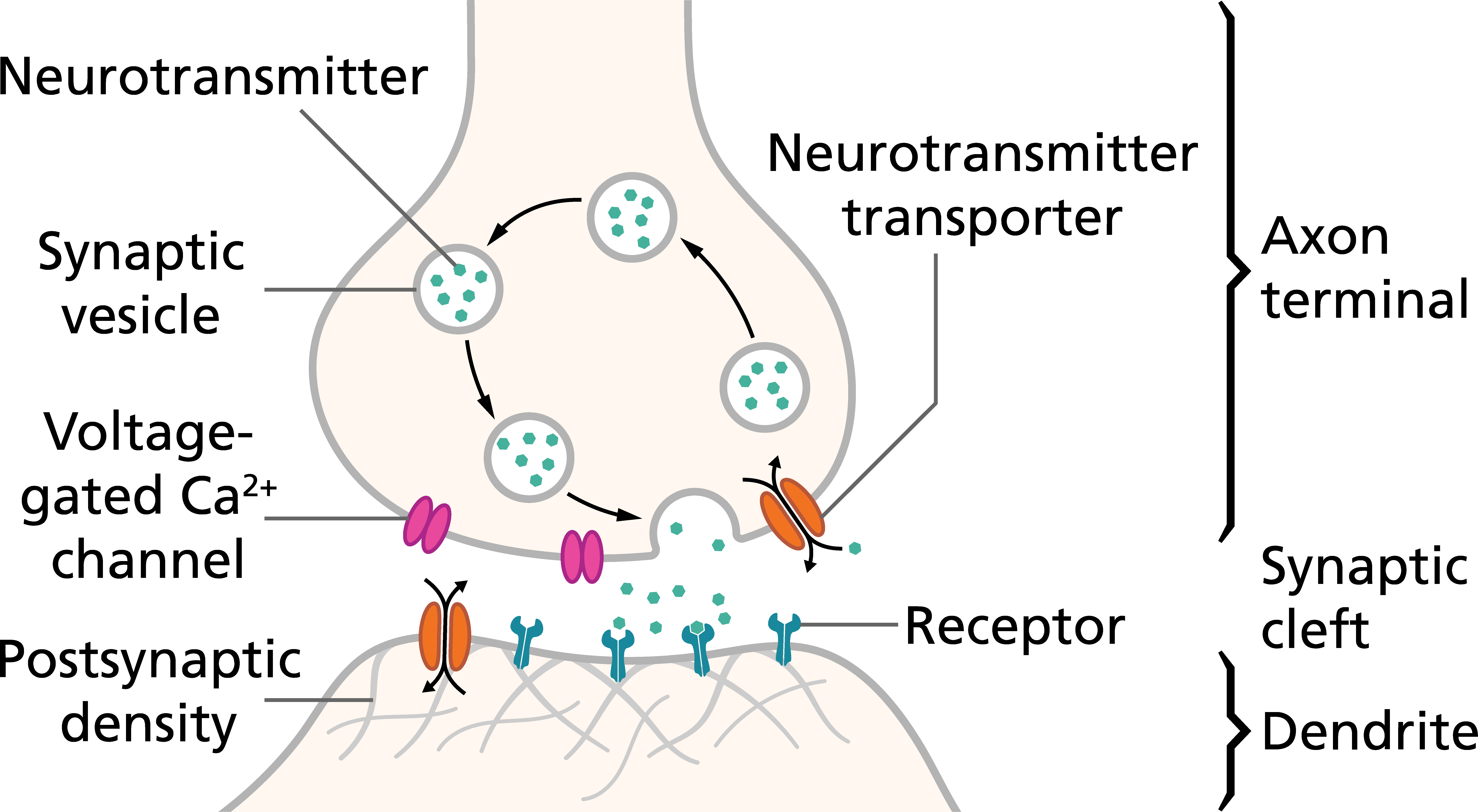 Neurotransmitters are chemicals that transmit signals from one neuron to the next. Neurotransmitters are packaged into vesicles located in the nerve terminal. When an action potential depolarizes the nerve terminal, voltage-gated Ca2+ channels are opened, allowing Ca2+ to enter the terminal. When the calcium ions enter the presynaptic terminal, they bind with special protein molecules on the inside surface of the presynaptic membrane, called release sites. This binding in turn causes the release sites to open, allowing a few transmitter vesicles to release their transmitter into the synaptic cleft (space between a nerve terminal and the dendrites or soma of another neuron). The released neurotransmitter binds to receptors on the dendrite or soma of the postsynaptic neuron. |