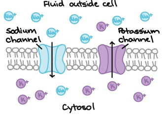 The lipid bilayer that forms the wall of a neuron (or glial cell) is not permeable to charged ions. However, there are a number of types of ion channels that allow ions to move down their concentration gradient across the membrane, and ion transporters that allow ions to move against their concentration gradient (from low concentration to high concentration). One of the best examples of an ion transporter is the sodium-potassium pump (also called Na+/K+ pump or Na+/K+ ATPase), which pumps potassium into a cell and sodium out of a cell, both against their concentration gradients, with the use of ATP to provide energy for the process. The actions of this pump sequester K+ inside of neurons and extrude Na+ from neurons (in other words, the sodium potassium pump causes intracellular K+ to be high and intracellular Na+ to be low, relative to the extracellular fluid).