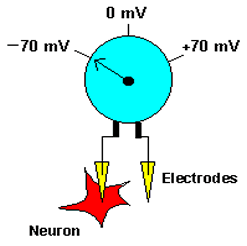 The term membrane potential refers to the electrical potential difference across the membrane of a cell. To accurately measure the membrane potential, an investigator would need to place one electrode inside the cell and another outside, and compare the voltage on the two sides (see figure to left). The membrane potential is generated by the number of charged particles (positive and negative) on the two sides of the membrane. Most of these charged particles are ions, although some proteins inside cells are negatively charged, and contribute to producing the membrane potential. Virtually all cells have an interior that is negatively charged with respect to the outside. |